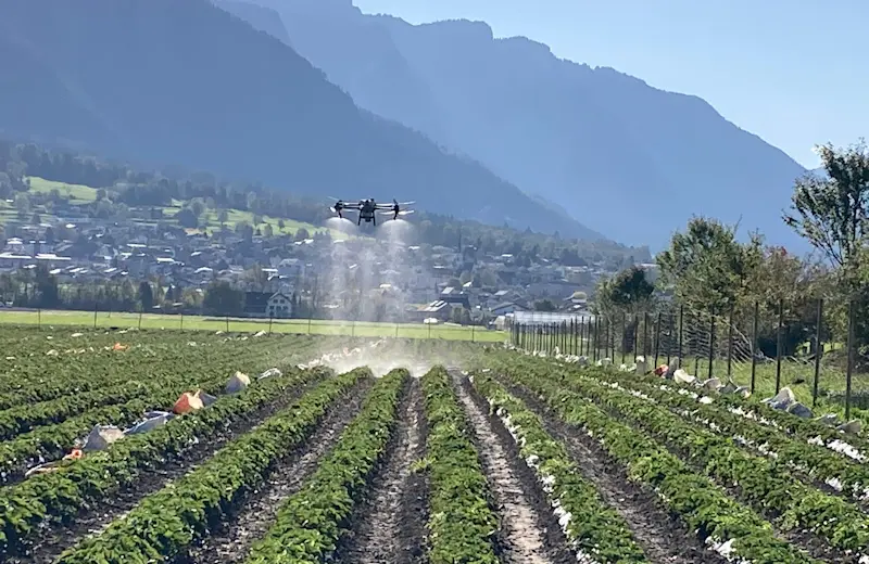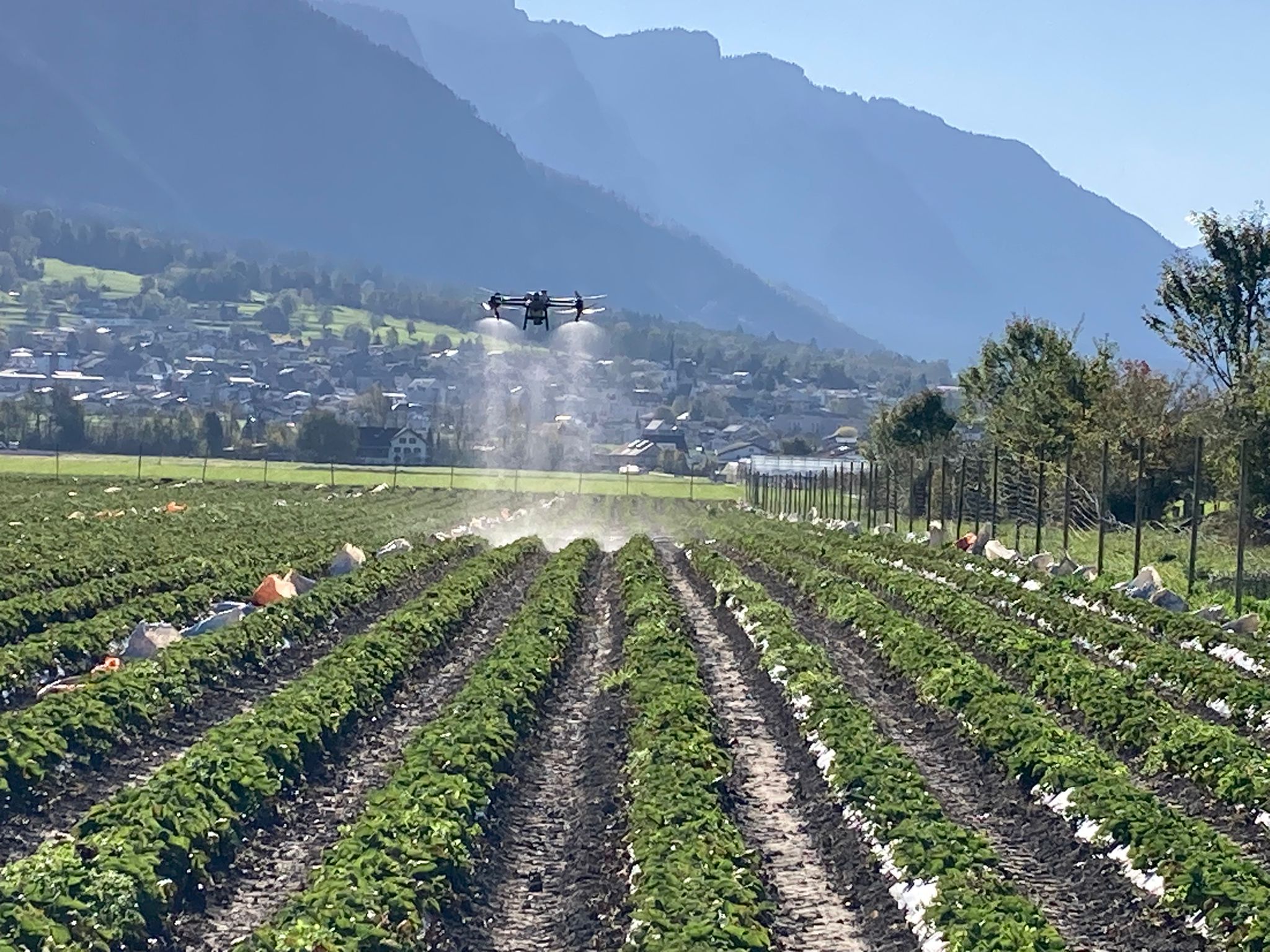 Mit der CropDrone werden Ackerkulturen aus der Luft mit Pflanzenschutzmittel besprüht. Dank der RTK-GPS-Technologie können Flugbahnen zentimetergenau eingehalten und mit gleichmässiger Geschwindigkeit abgeflogen werden. Dies begünstigt eine homogene Applikation unabhängig der topografischen Voraussetzungen.