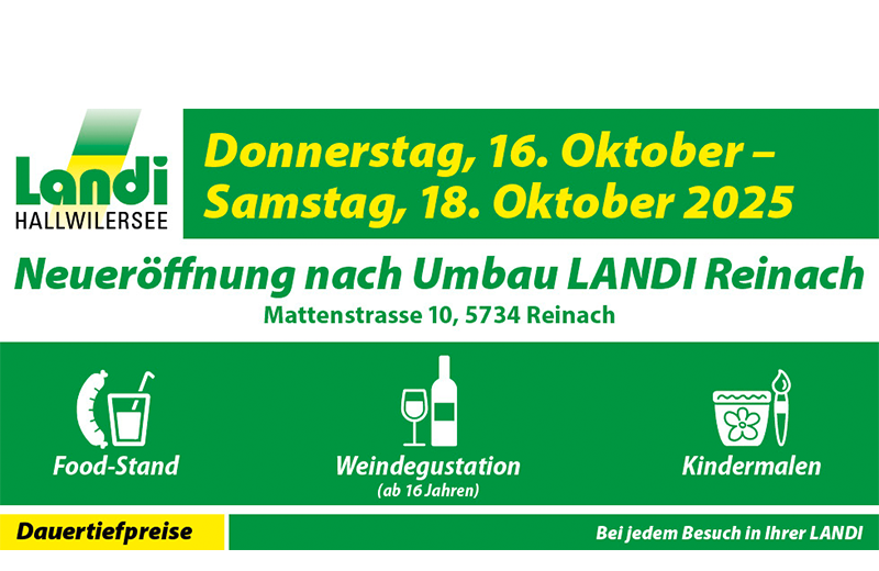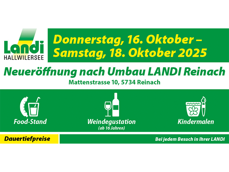 Feiern Sie mit uns die Neueröffnung der LANDI Reinach nach dem Umbau! Freuen Sie sich auf ein abwechslungsreiches Programm für Gross und Klein: