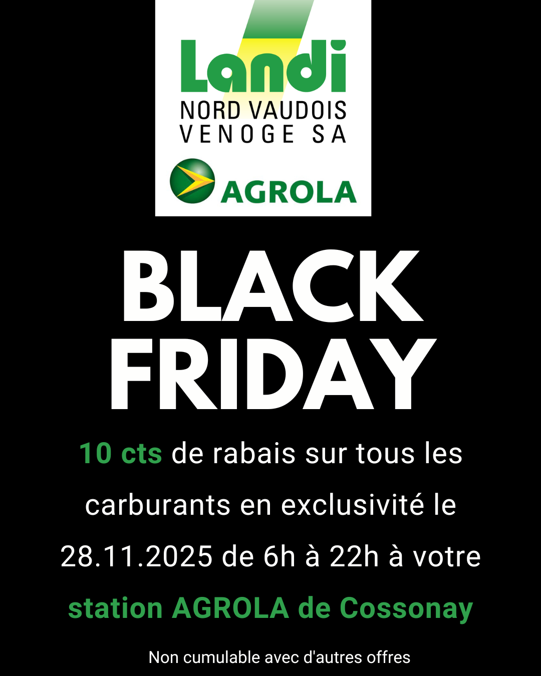 10 cts de rabais sur tous les carburants en exclusivité le 28.11.2025 de 6h à 22h à votre station AGROLA de Cossonay