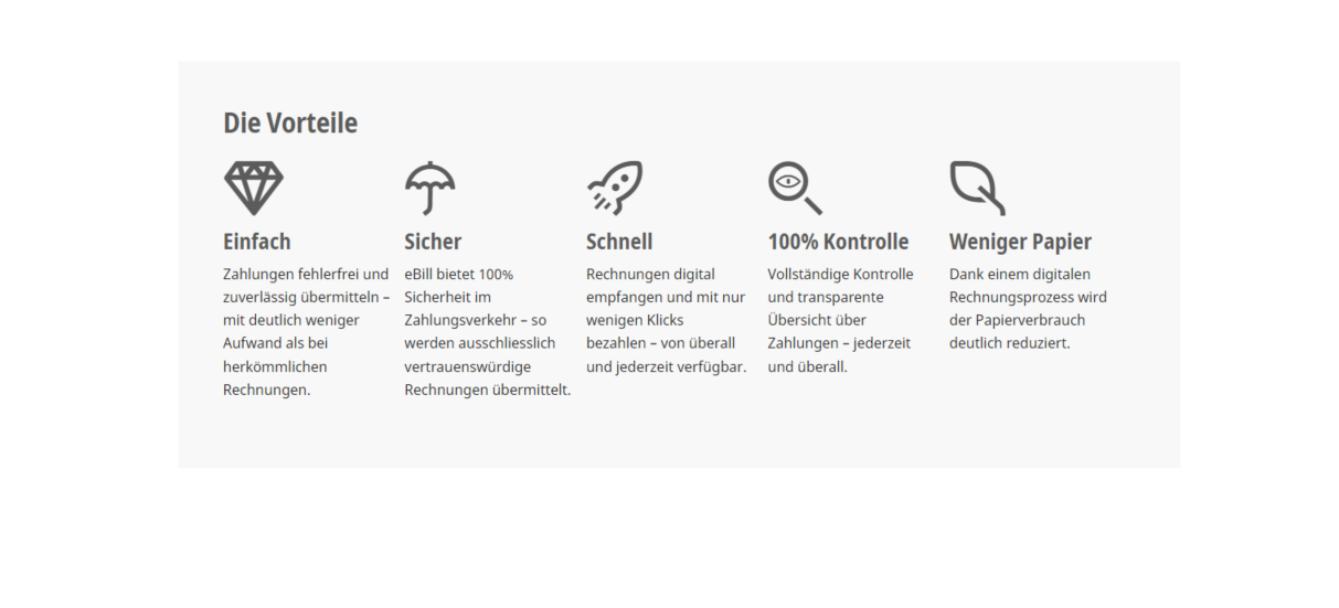 Sie erhalten die Rechnungen einfach, schnell, papierlos, kontrollierbar und sicher in Ihrem E-Banking System.