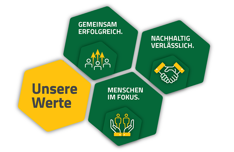 Wir sind gemeinsam erfolgreich, weil wir nachhaltig und eng mit Mitarbeitenden, Netzwerk, Genossenschaftern, Kunden, Lieferanten und Partnern zusammenarbeiten und aufeinander achten. Dieses partnerschaftliche Miteinander soll den Erfolg des Unternehmens und des gesamten Netzwerks sichern.