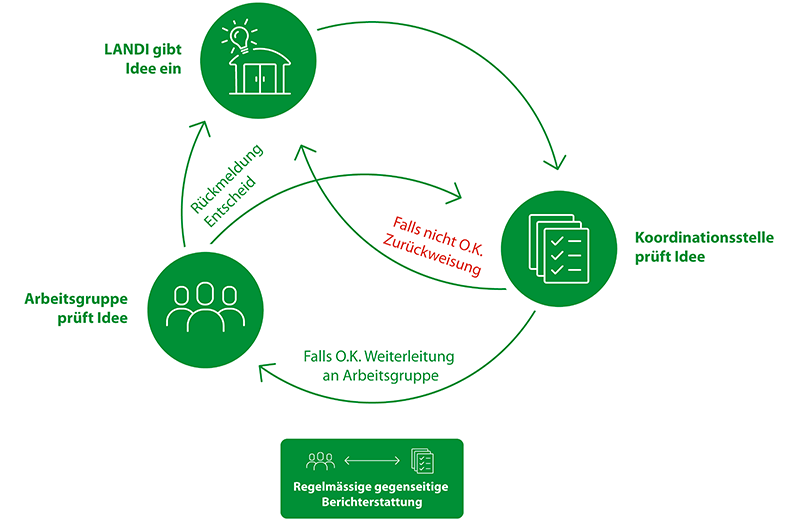 Der Innovationsprozess sieht vor, dass Ideen von LANDI strukturiert via Innovationsmeldung an die Koordinationsstelle Innovationen LANDI ( innovation.landi@fenaco.com ) eingegeben werden. Diese Stelle weist die Ideen der verantwortlichen Arbeitsgruppe zu, welche diese bespricht, auswertet, und die weiteren Schritte bestimmt. Anschliessend erfolgt eine Rückmeldung an die LANDI, welche die Idee eingegeben hat. Die Koordinationsstelle für Innovationen LANDI wird zukünftig die Prozessverantwortung für eingegebene Ideen tragen und eine regelmässige Berichterstattung an die LANDI Welt sicherstellen.